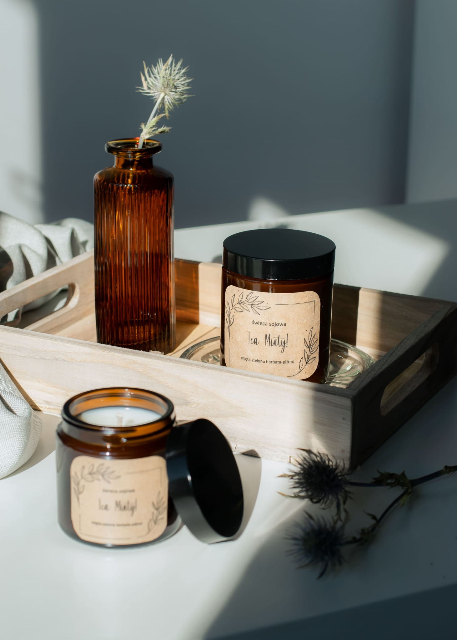 Tea Minty, czyli świeca sojowa reprezentująca nasze przydomowe ogrody, w których po prostu nie może zabraknąć pięknego i świeżego zapachu mięty. Ogrodowa mięta to jedna z obowiązkowych roślin rosnących w naszych ogródkach lub po prostu w doniczce na balkonie lub parapecie. Jej mocny i orzeźwiający zapach, który unosi się w powietrzu potrafi wywołać uśmiech na niejednym domowniku, który akurat przebywa w jego otoczeniu. A co by się stało jeżeli chcielibyśmy pójść krok dalej i wzbogacić ten wspaniały zapach mięty w naszym domu lub ogrodzie? Naszym pomysłem było połączenie mięty z aromatycznym zapachem zielonej herbaty, który wzmocniliśmy odrobiną piżma. Jakie wyszły tego efekty? Odpalcie naszą świecę i sami się przekonajcie. Zobaczycie, że warto!