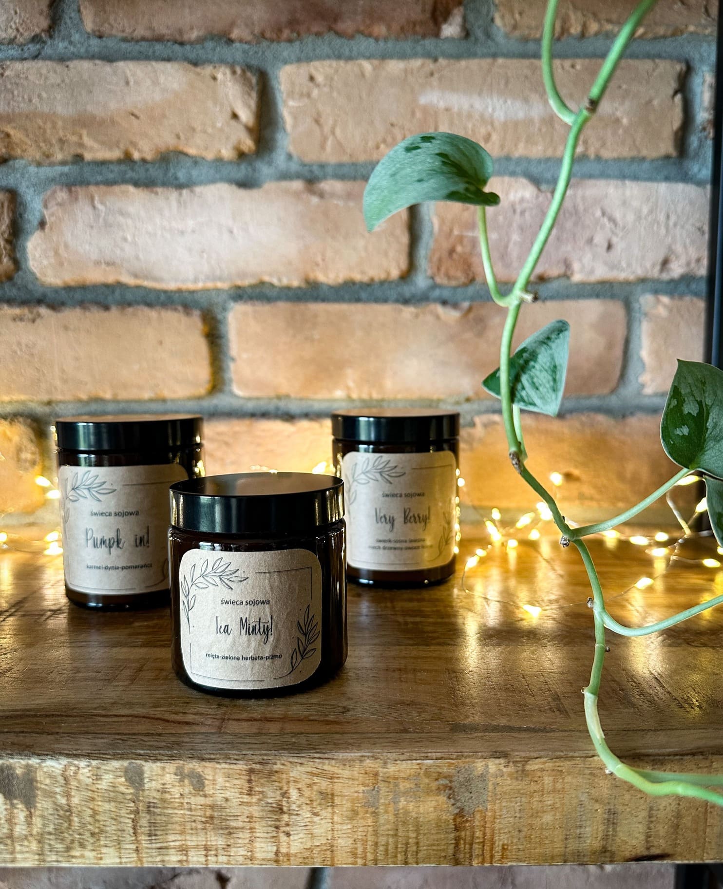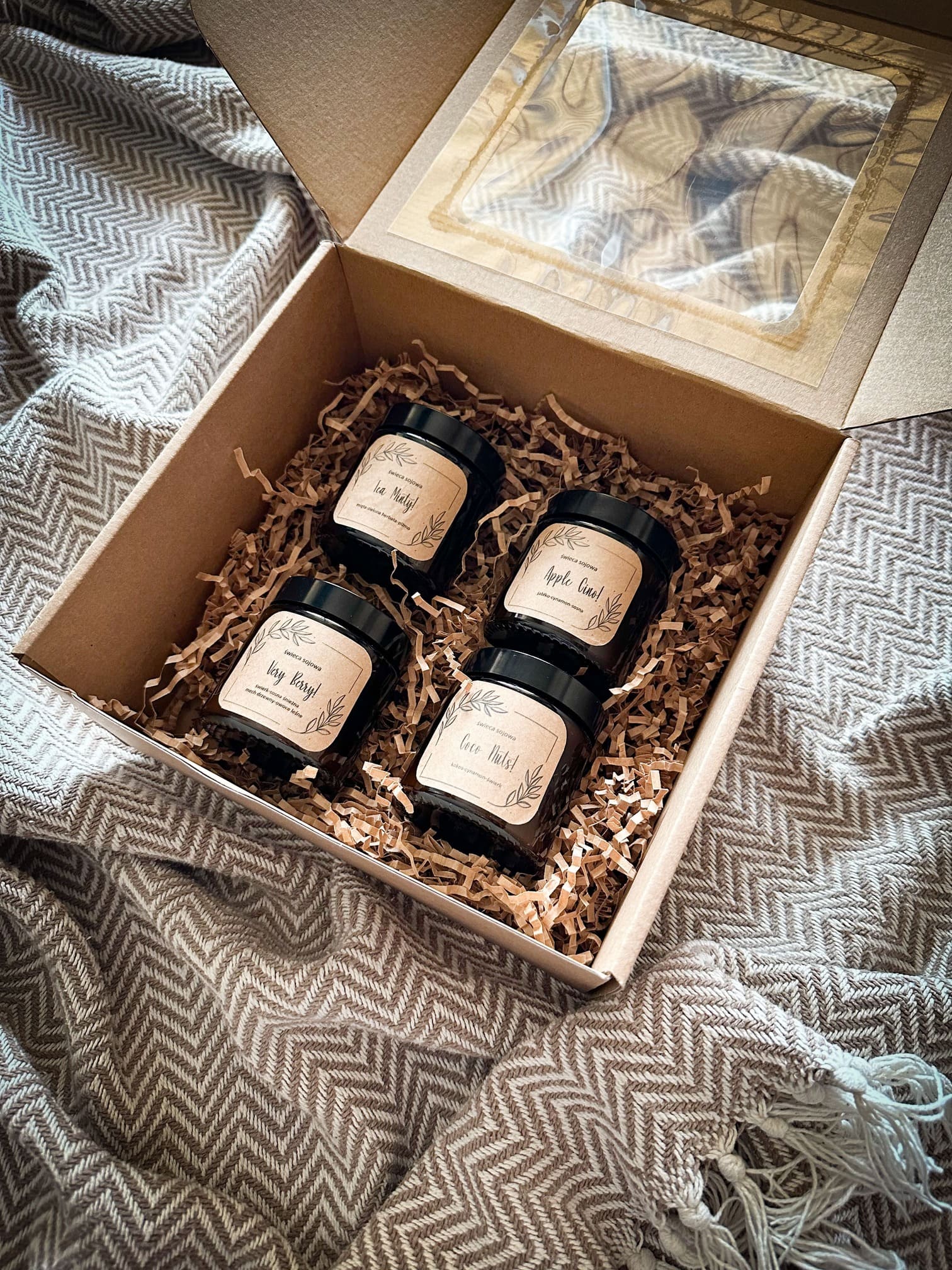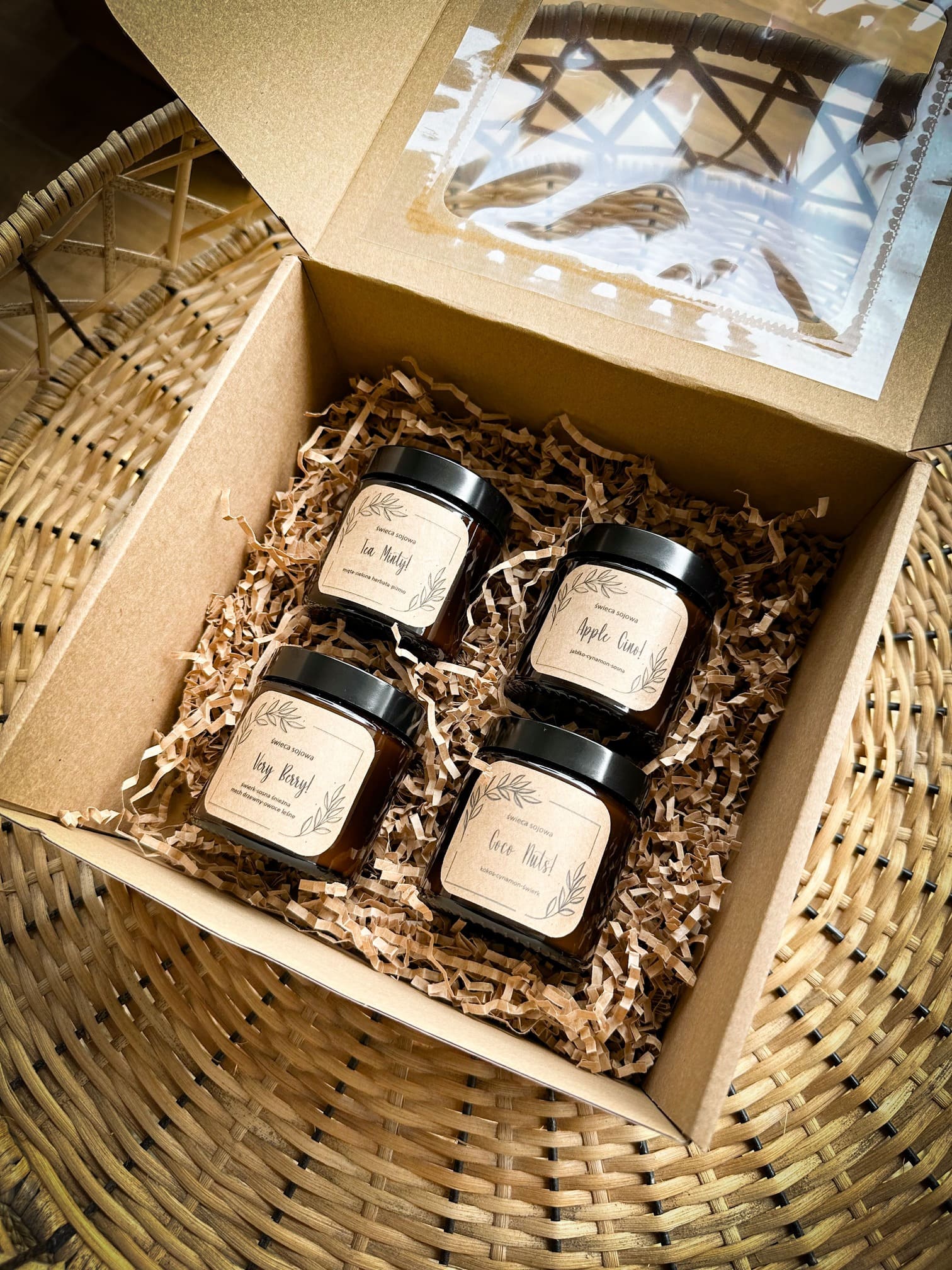 - Cztery sztuki naszych ekologicznych, wegańskich świec sojowych dostępnych w 10 zapachach do wyboru, każda o pojemności 120 ml,